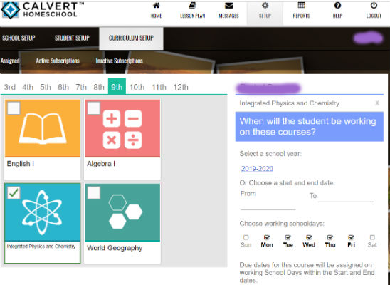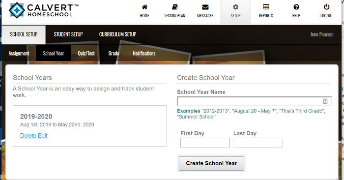 Calvert makes getting started easy. Within the Setup tab, I entered the dates for our current school year.