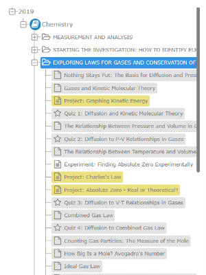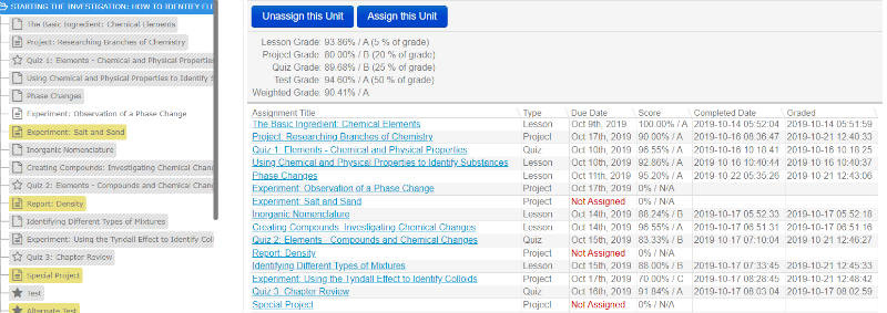 Clicking on an individual unit title reveals a complete list of assignments. Several tasks are highlighted in yellow. These optional materials are not assigned.
