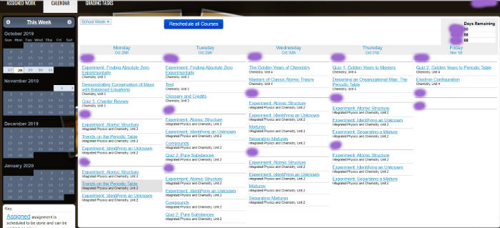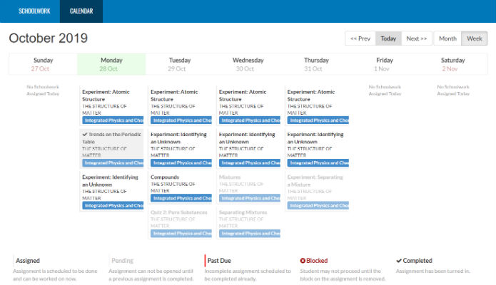 The Calendar tab provides an alternative view, which shows me the daily assignments for all of my students.