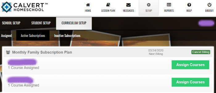 Within the Curriculum Setup section, I clicked the Active Subscriptions tab to assign courses to each student.