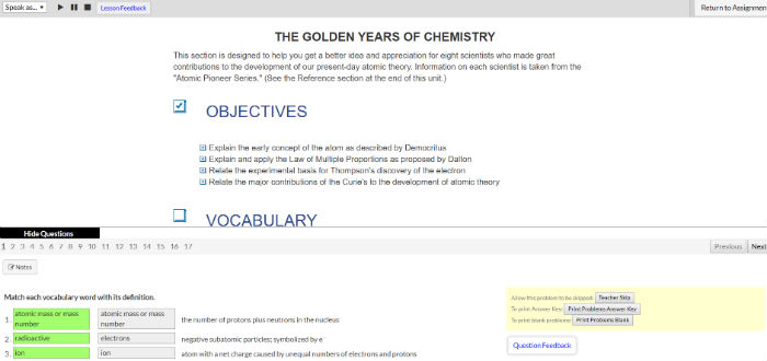 “The lesson talks about scientists organizing the table of elements by atomic weight. They realized that some of the elements had similarities to each other and could be organized in rows and columns.”