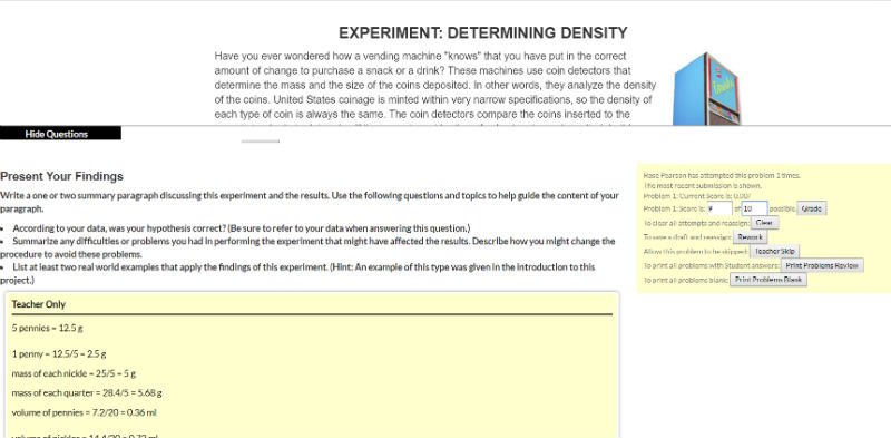 The online labs are sometimes confusing. In the first unit of chemistry, my high schooler was asked to record measurements for an assortment of objects represented in an on-screen animation. Although we anticipated that each object would be consistently sized throughout the experiment, some were not. After rewatching the video myself, I confirmed my daughter’s measurements and gave her credit.