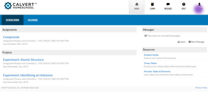 When my daughter logs in to her Calvert Homeschool account, she sees a list of the day’s assignments. Ongoing projects are included, so she can start working on them.