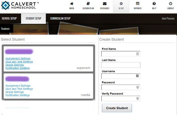 Next, I clicked on Student Setup and assigned each daughter a username and password.
